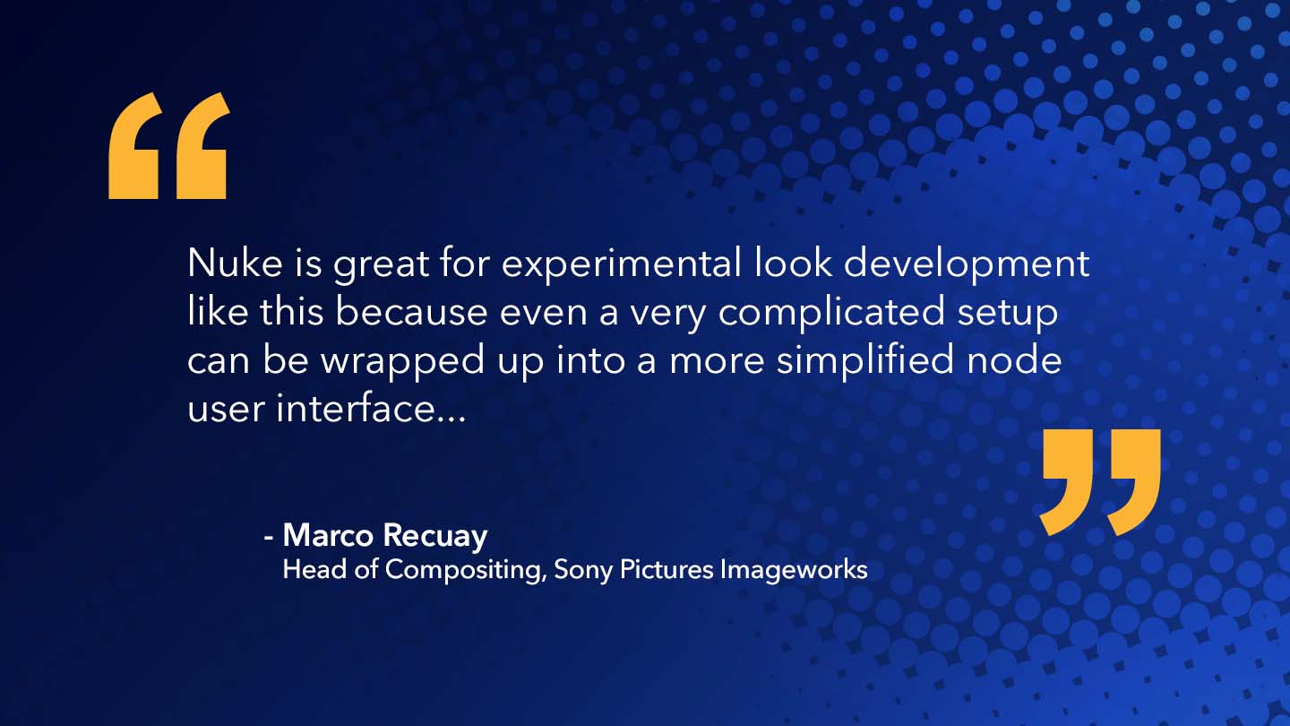 Quote from Marco Recuay, Head of Compositing, Sony Pictures Imageworks: Nuke is great for experimental look development like this because even a very complicated setup can be wrapped up into a more simplified node user interface...