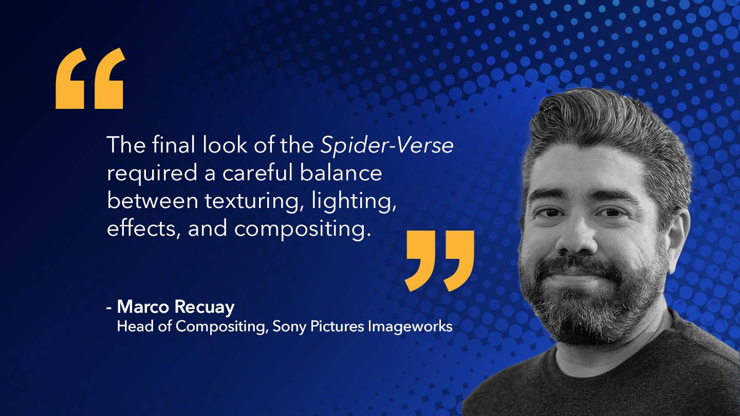 Quote from Marco Recuay, Head of Compositing, Sony Pictures Imageworks: The final look of the Spider-Verse required a careful balance between texturing, lighting, effects, and compositing