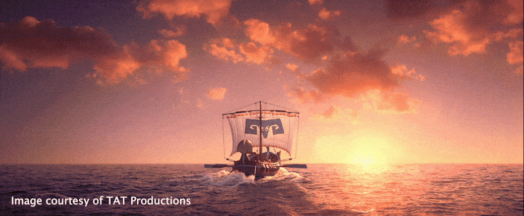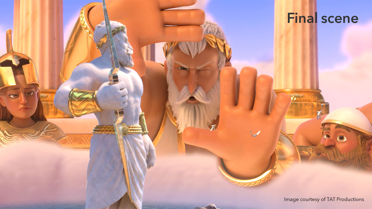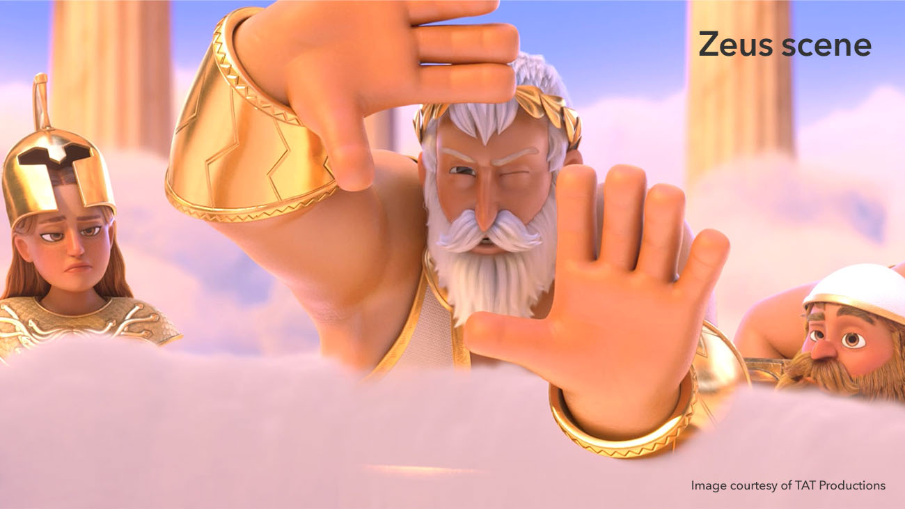 One of the most technical challenges the team had to manage on Epic Tails was the Zeus sequence. In that particular sequence, King of the gods Zeus is looking at the main character's adventures in his basin and he’s playing with it. But what were the challenges?