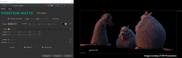 Finally, they created Position Matte, a tool based on Deep and Position World information that allowed the studio to create custom Position Mattes, Z Depth, 3D noise, or Vertical Mattes. All these tools do the math operation in Deep, therefore the anti-aliasing is preserved, and they have little to no edging artifacts. “It’s all linked to the shot camera — extracted from EXR metadata — so we don’t have to manually rotoscope,” says Romain.