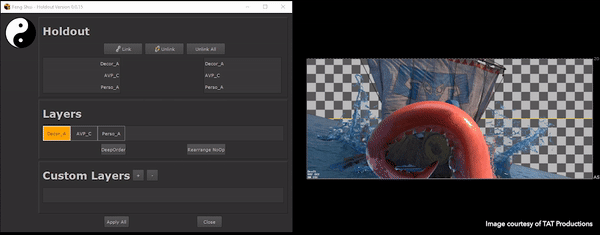 Above is Feng-shui, a tool the team created and used for Holdout and order management. For large comps with a lot of layers, this is a great quality-of-life tool for the artists, enabling them to access, inspect, and change the order of the layers, all in a simple window.