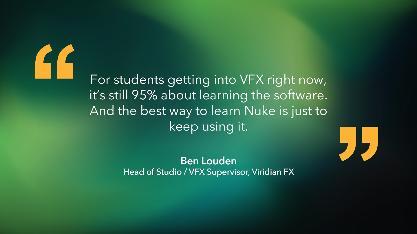 Ben Louden, Head of Studio / VFX Supervisor, Viridian FX: “For students getting into VFX right now, it’s still 95% about learning the software. And the best way to learn Nuke is just to keep using it.”