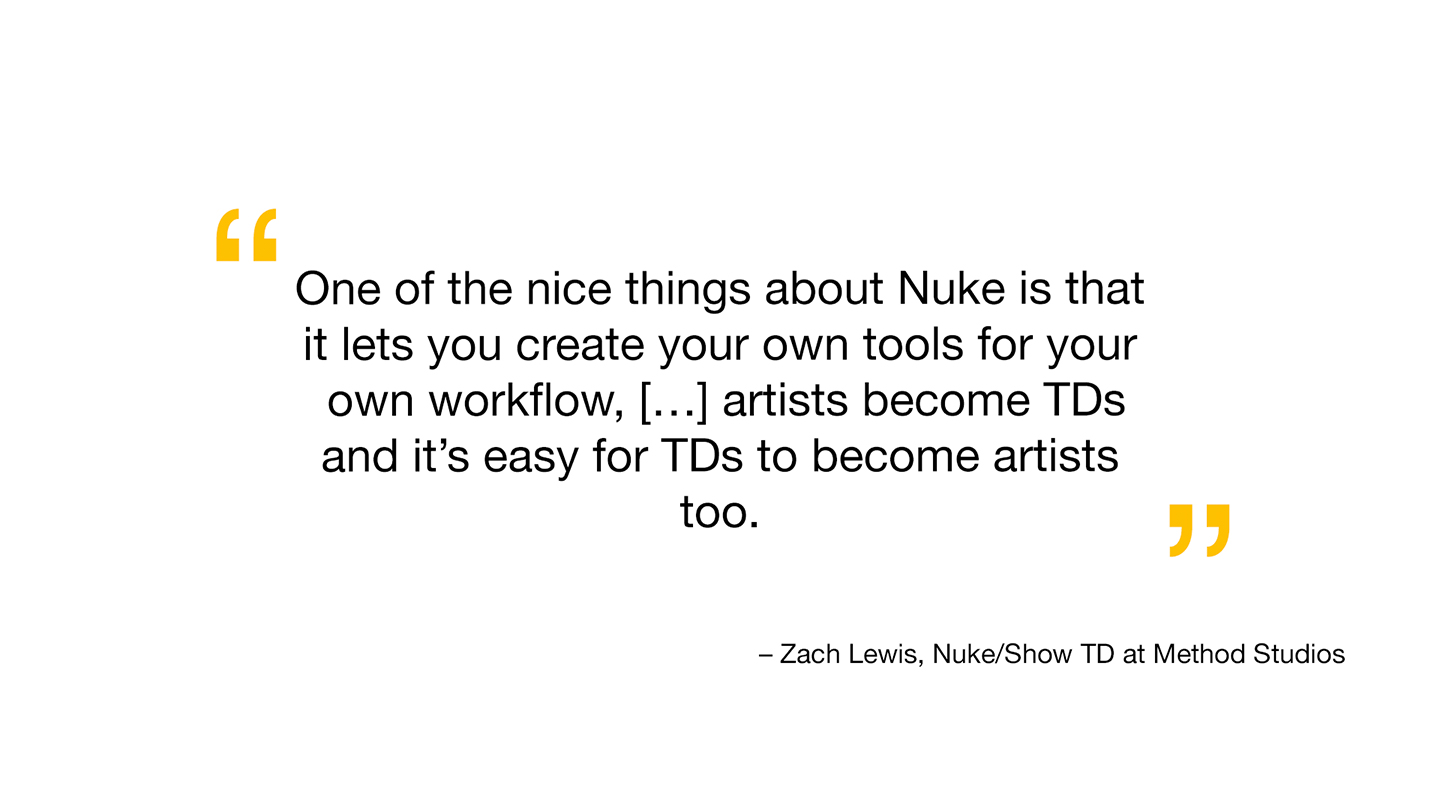 “One of the nice things about Nuke is that it lets you create your own tools for your own workflow,” Zach continues. “Artists become TDs and it’s easy for TDs to become artists too.”