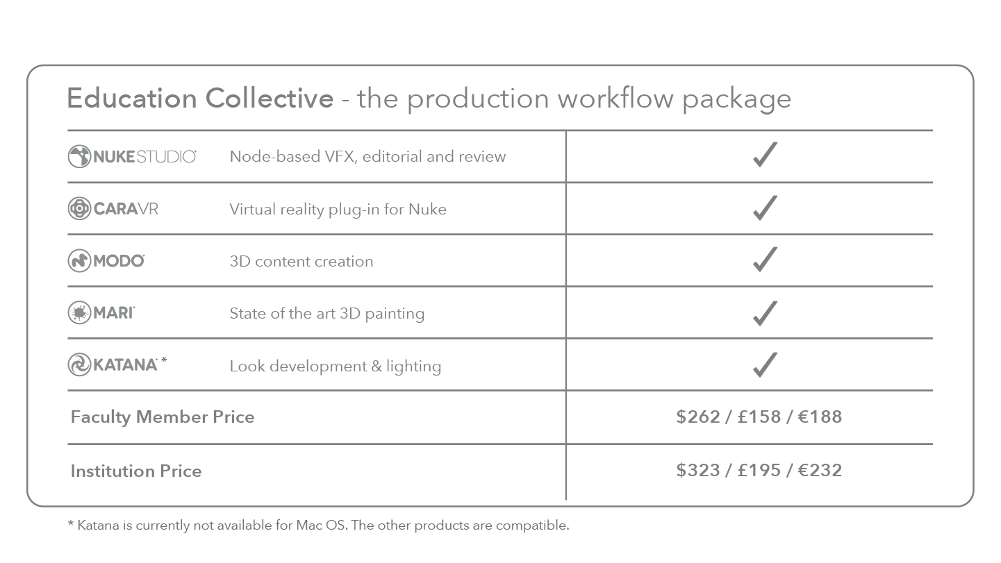 Foundryの教育プログラムは、次世代アーティストの育成を目的として、実際の制作現場で使用されているソリューションを低価格で提供するものです。学生、卒業生、教員および教育機関を対象に、PRODUCTION COLLECTIVE(Nuke Studio、Modo、Mari、 さらにCara VR付)、およびCREATIVE COLLECTIVE(Hieroplayer、Modo、Mari)の 大幅な製品価格割引を実施しています。