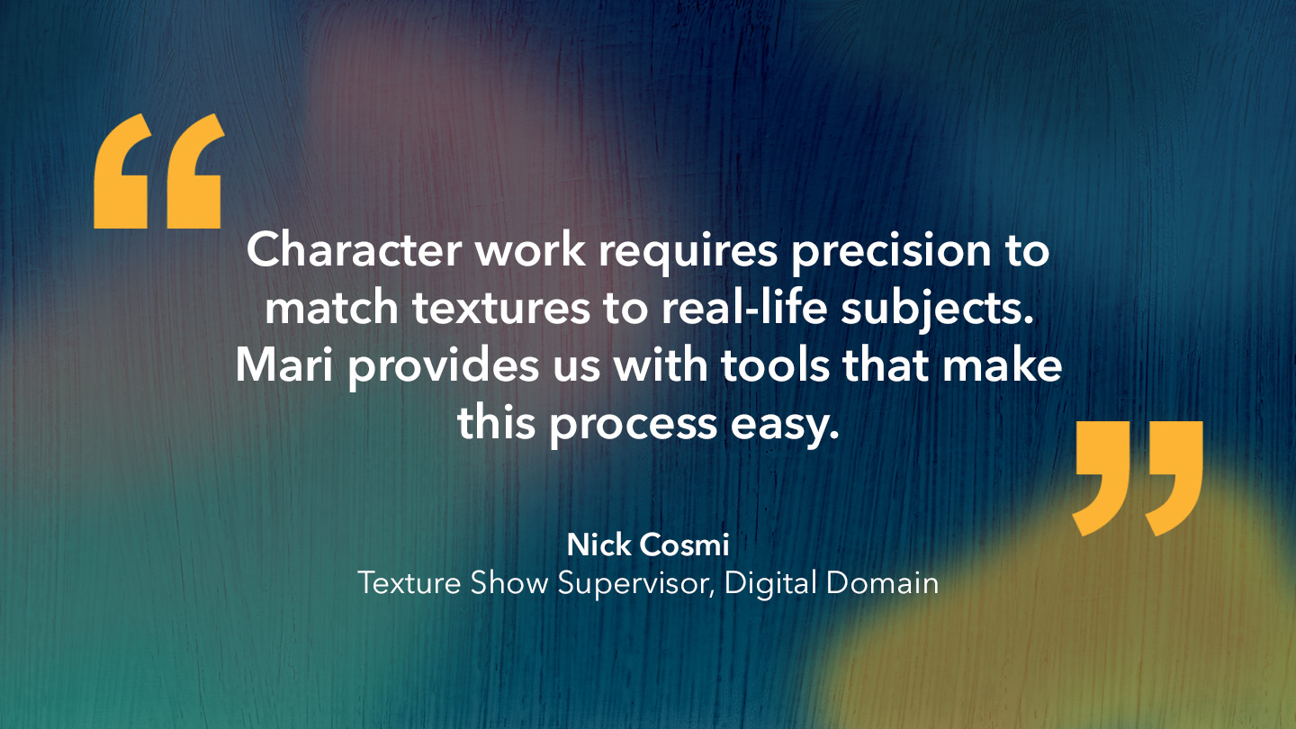 Mariには、アーティストが1:1のテクスチャを迅速に作成できるだけでなく、デジタル・ドメインのチームにとって、スキャンの問題箇所を修正しやすくなるなど、さまざまなメリットがあった。「キャラクタースキャンでは、まぶたや鼻孔、あごの下など、細部が欠損することがよくあります」とCosmi氏は言う。「例えば唇の内側の修正の方が、体の他の部分よりも時間を要するのです」。