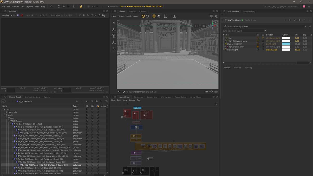 「特に漏刻部屋のボリュームフォグや水表現においては、スケール感の表現に苦労しましたが、Katanaのノードベースアプローチにより、さまざまなパターンをすぐに確認でき、トライアンドエラーが容易でした。加えてアセットの更新が簡単なため、ライティング時にアセットの更新が発生しても対応に苦慮することはなかった」と石田氏は言う。