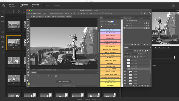 Flixなら、PhotoshopでもStoryboard Proでも、使い慣れた方法で作業できます。レイヤー合成やタイムラインフレーム、あるいはレイヤースタックであれ、FlixがPhotoshopファイルの命名、整理、管理を自動で行います。特定のファイルを検索する場合には、ライブラリからFlixに送信されたすべてのファイルにアクセスできるので、シークエンス、アーティスト、作成日でボードをフィルタリングして検索できます。