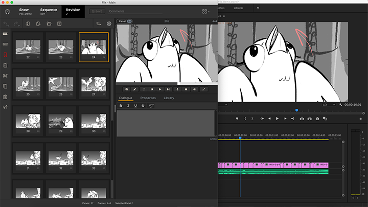 アーティストがボードに手書きしたダイアログは、FlixのDialogueワークスペースのサムネイルで簡単に確認でき、テキストボックスに入力するのも容易です。さらに、Flixはダイアログの修正履歴をすべて記録し、過去のバージョンを簡単に見つけて復元することが可能です。