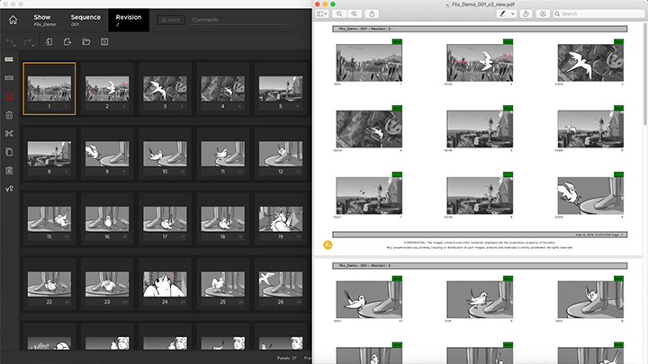 Flixはプリプロダクションの中心に位置し、チームのコラボレーションやアイデアのイテレーションを容易にします。アーティスト、制作スタッフ、ディレクター、エディターなど、誰もがプロジェクトの各セクションの最新バージョンにアクセスでき、長編作品でもエピソード作品でも対応可能です。個々のボードにコメント、メモ、フィードバックを残すことができ、チーム全体でレビューやディスカッションを行うことができます。Flixを使えば遠隔地のアーティストとも常に最新の情報を共有できるので、まるで同じスタジオにいるかのようなコミュニケーションを取りながら、効率的に作業を進めることができます。
