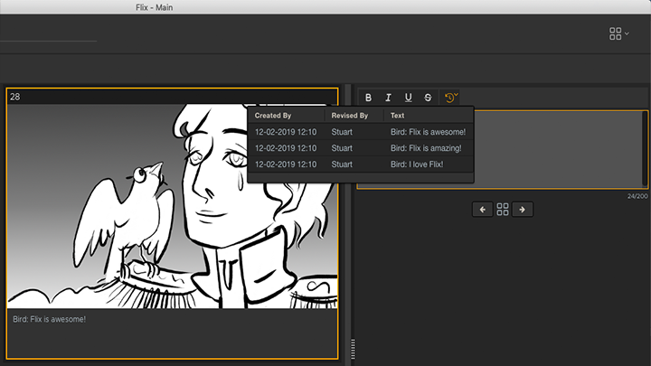 The dialogue handwritten by artists on their boards is easily viewable on the thumbnails in Flix’s Dialogue workspace, making it easy to keep track of and input into the text box. What’s more, Flix keeps track of all the iterations of your dialogue and lets you easily find and restore previous revisions.