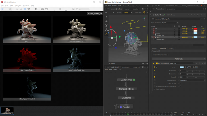 In 3Delight Display, a lighting artist can click and drag on top of an image to rebalance light intensities and colours of individual lights or groups of lights. All edits are fed back to the GafferThree nodes in Katana so changes are captured at the source. This workflow is a complement to live renders as the images can be at final high resolution quality, creating a rich collaborative workflow between artists, art directors and clients.