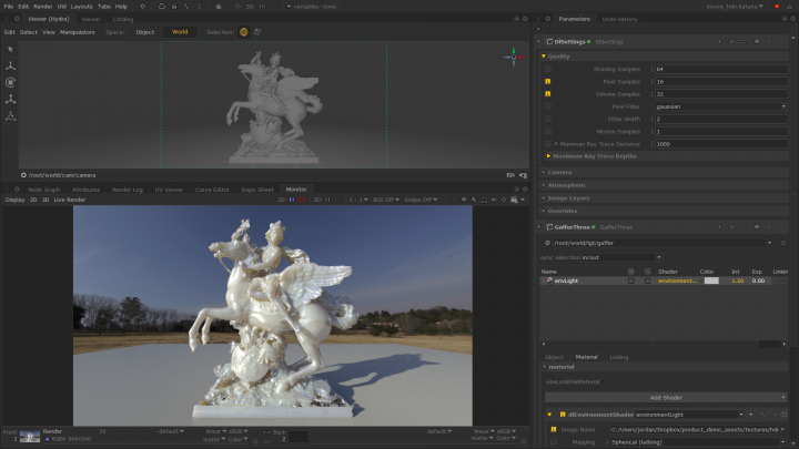 Live rendering in Katana with 3Delight NSI is a liberating experience. Changes to almost all aspects of global controls, scene content, lights, cameras, geometry, surface and displacement shaders, update quickly during a live render. Start a live render session and just work.