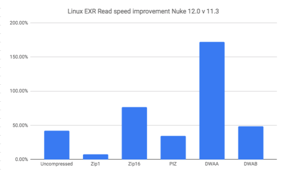 The result is improved performance using EXR, with the biggest gains seen on planar-based compression types including PIZ, Zip16, and DWAA. EXR performance also benefits from upgrading to version 2.3 and being compiled with SSE4 (Streaming SIMD Extensions 4).
